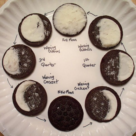 On the construction paper, write the name of each moon phase. Stick or place each Oreo next to its label in the correct sequence. Bonus points if you arrange them in a circle to represent the moon’s orbit around Earth. -